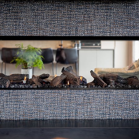 A tastefully wallpapered central walk-around feature wall with a double-sided fireplace provides space for artwork, and to showcase the owner’s personality.